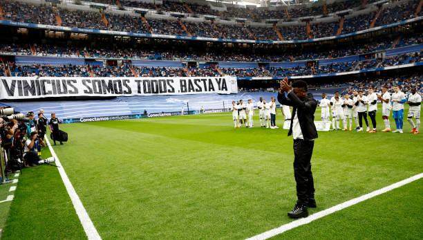 这个西班牙足球界在过去3天被声讨种族主义的浪潮所淹没,各方都在积极回应维尼修斯以及受侵害群体的诉求。尽管足协撤销了维尼修斯的红牌,但在与俱乐部主席深谈过后,巴西人还被保护起来,没有进入本场比赛名单,而是与弗洛伦蒂诺一起坐在主席台上。维尼修斯在赛前接受了全场球迷的欢呼,而对阵双方包括替补球员都穿上他的20号球衣合影,表达了团结起来对抗歧视的决心。全场观众还在比赛第20分钟为维尼修斯鼓掌打气。巴西人不是普通球员,更是皇马的核心、西甲的头牌,如果因为一些宵小气走球星,砸了牌子,西甲将永远失去对天才球员的吸引力。