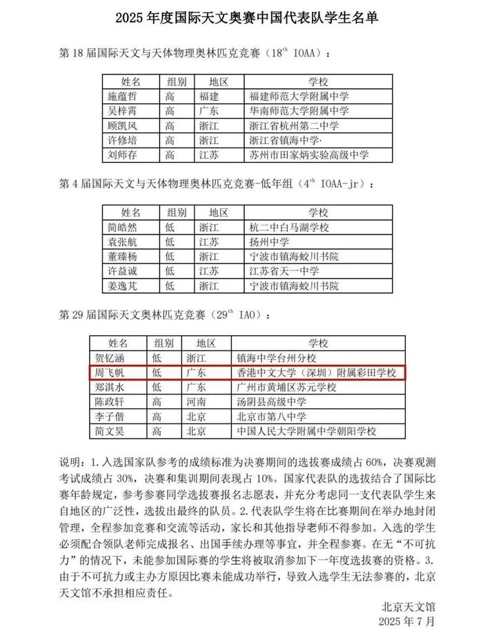 图源:福田教育在北京天文馆公布的 2025 年度国际天文奥赛中国代表队名单里,他成为深圳唯一入选的“幸运儿”。接下来,他还将随中国队出征罗马尼亚,在第 29 届国际天文奥林匹克竞赛的舞台上,代表深圳与世界同好对话。原来追星星的人,自己也会变成光。